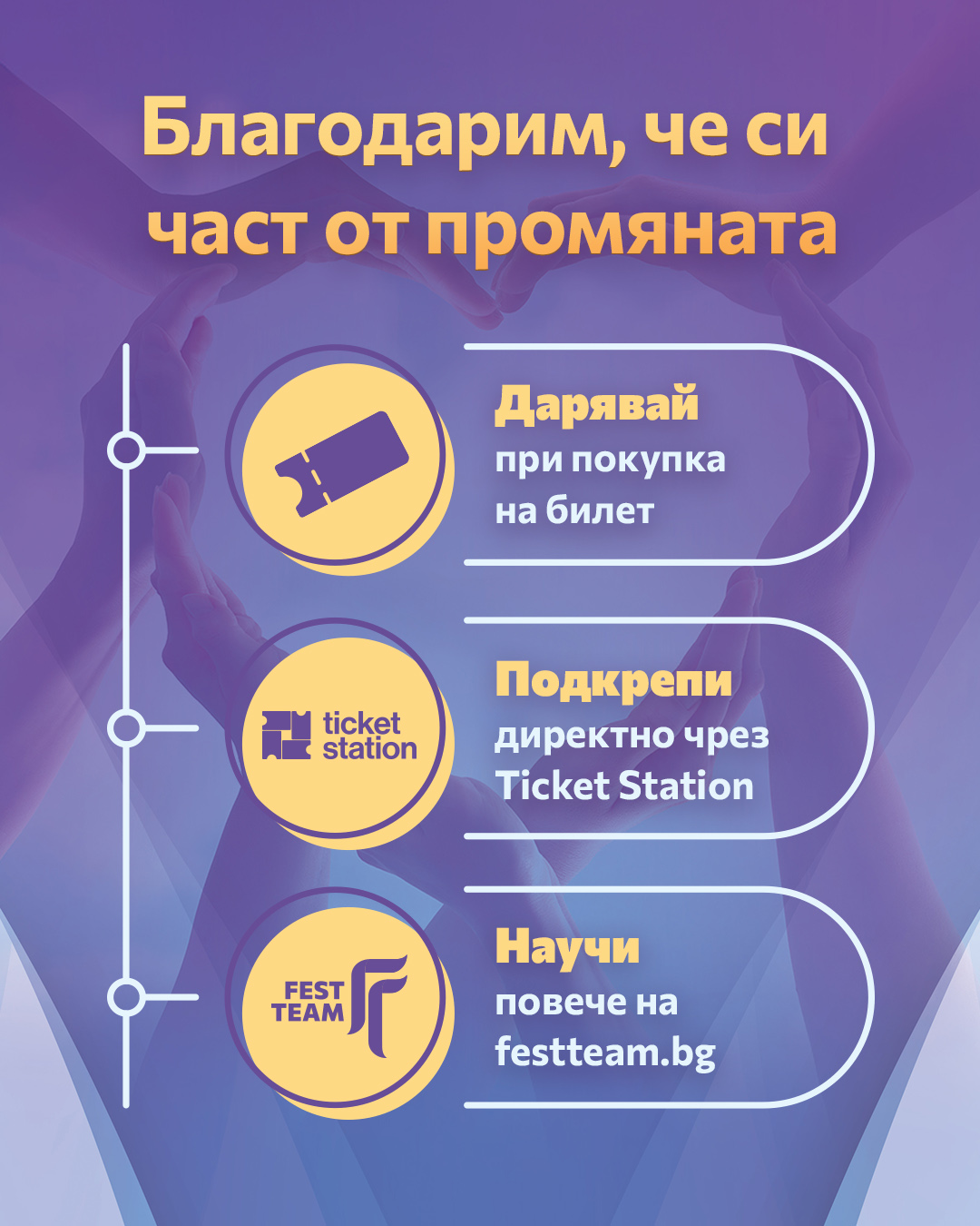 Fest Team продължава да полага системни и устойчиви усилия за по-добро бъдеще чрез инициативите, които подкрепя. Дарителите могат да подкрепят каузите не само по време на покупка на билет за събитията на Fest Team, но и директно чрез мрежата на Ticket Station. Повече подробности, финансова отчетност и истории на реални хора — на сайта на Fest Team.